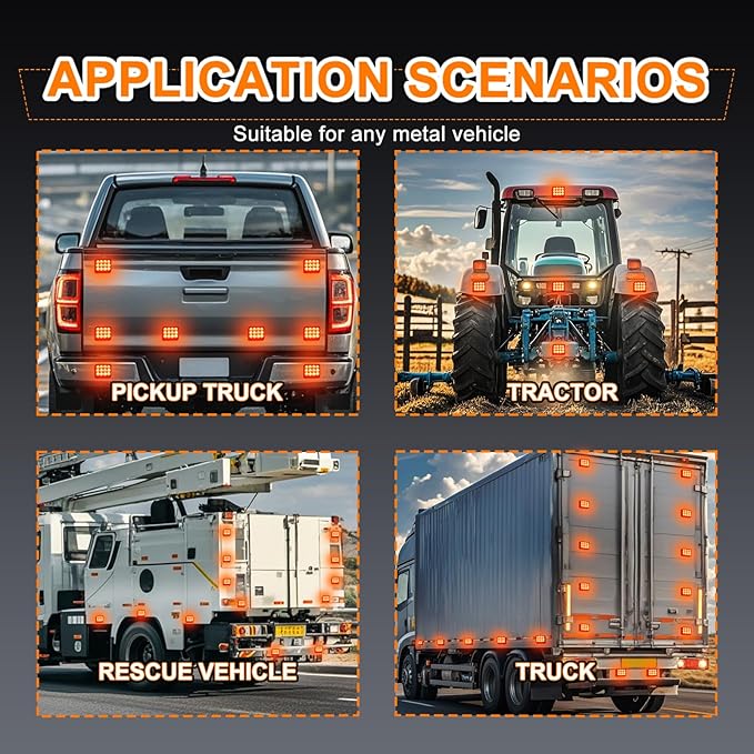 • 【Wide Range of Applications】Nrgedzam's magnetic strobe lights with super magnetic base, which greatly reduces the installation process of wires. Beacon lights for trucks are suitable for 12-24V DC powered universal vehicles , such as trailer, trucks, tow, ATV, SUV, RV, bus, tow, engineering vehicles, emergency vehicles, pickups truck, van, postal service, construction vehicle, truck vehicle, forklift, camper, snowplow, cars, tractor, caravan, golf carts, boating, agriculture and emergency safety warning, etc.