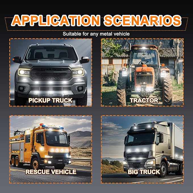 • 【Wide Range of Applications】Nrgedzam's magnetic strobe lights for trucks use a magnetic base, which greatly reduces the installation process of wires, for all vehicles, such as trailer, trucks, engineering vehicles, emergency vehicles, ATV, UTV, SUV, RV, tow, pickups truck, van, postal service, construction vehicle, truck vehicle, forklift, camper, snowplow, cars, tractor, caravan, golf carts, boating, agriculture and emergency safety warning, etc.
