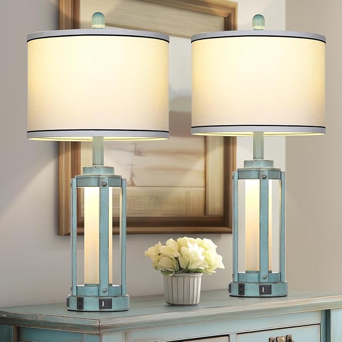 • Farmhouse Vintage Industrial Design:The lamp set of 2 offer a well-crafted rustic vintage design with a unique feature of dual night lights, making multiple lighting options. The pretty fabric lampshade complements the metal lamp stand, creating an elegant style with a warm 2700K glow. The lampstand's metal column and layered design allow the nightlight glow to warmly permeate, adding an comfortable vibe to your home space!