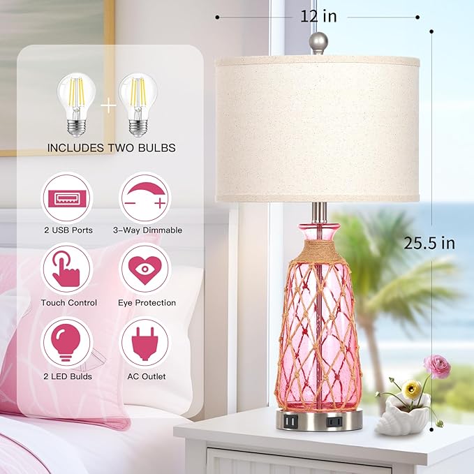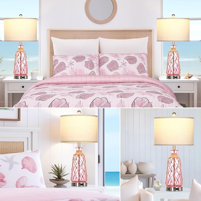 25.5" Coastal Glass Table Lamps Set of 2, 3-Way Dimmable Touch Control Bedside Lamps with 2 USB Ports and AC Outlet, Pink Nautical Nightstand Lamps for Bedroom Living Room (LED Bulbs Included)