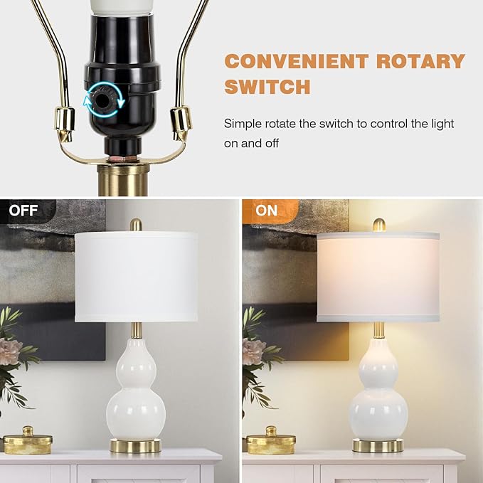 • 【Unique Ceramic Table Lamps】Unique gourd shape. This white table lamp is simple and versatile, especially suitable as your working lamp, bedside lamp and reading lamp on the bedside nightstand, or as a decorative lamp on the living room, providing you with warm and soft lighting