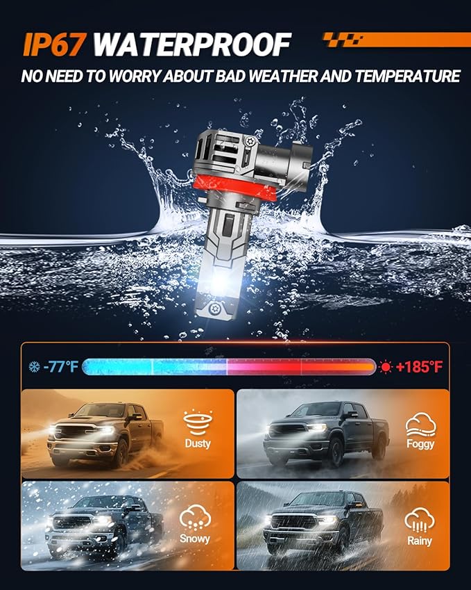 • 【50000+ Hours Lifespan】Equipped with a high-speed cooling fan operating at 13000 RPM, Sealight H11 bulbs provide exceptional heat dissipation. This advanced cooling technology ensures over 50,000 hours of reliable illumination, making these bulbs highly durable. Additionally, IP67 waterproof technology allows them to perform reliably in various weather conditions.
