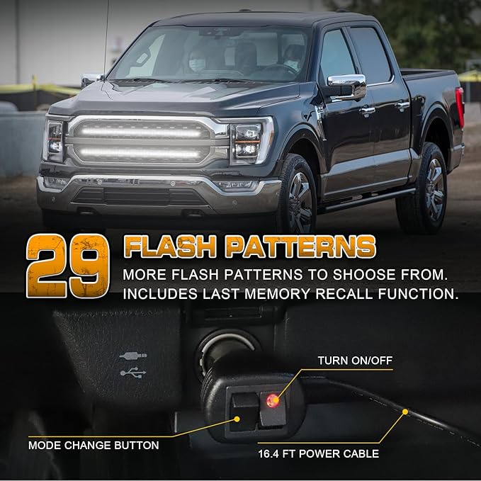 • 【QUICK RESPONSE】Just plug in the 12V cigarette lighter switch, and control the strobe mode you need through the cigarette lighter switch, with memory function. 29 different flashing patterns , very handy for late night calls, first responder, storm work or danger.