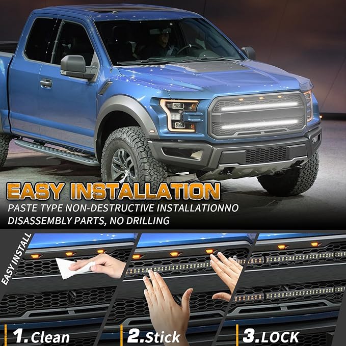 • 【EASY TO INSTALL】No need to drill, just clean the mounted surface and peel and stick the emergency lights strip for installation. Strong adhesive and cable ties ensure stable installation. Even driving through lots of rain, highway speeds, potholes, the satety light can still stay on and work great.