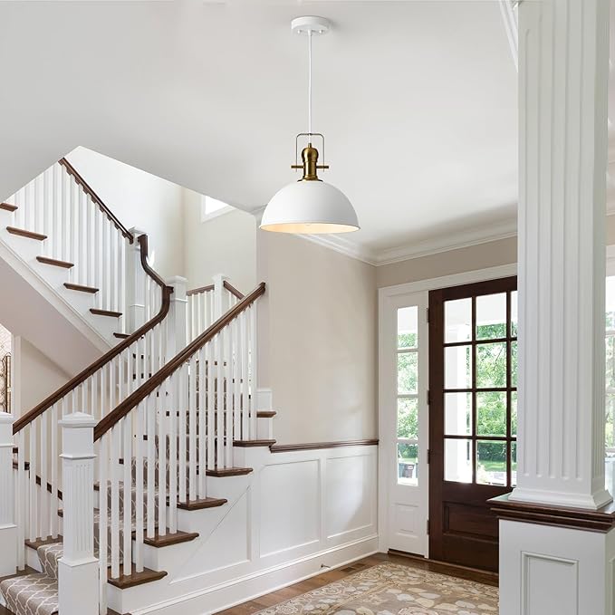 • [Industrial & Vintage Design]: 1-Light industrial farmhouse pendant light fixtures with adjustable cord,white finish featuring retro-style dome shade, this antique pendant lighting is made of sturdy metal construction in black finish and inner gold finish.The vintage pendant lights is ideal for home, dining room, kitchen island, warehouse, entryway, corridor, restaurant, cafe, bar, club, barn, working bench.