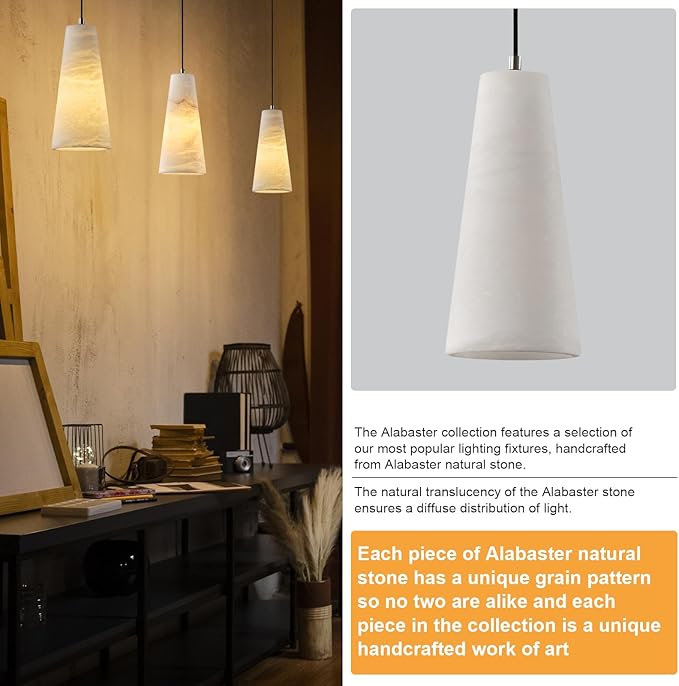 • 【Height Adjustable & Dimmable】Experience the flexibility of this alabaster kitchen pendant light. Height adjustable with 79"cord length and strap length to adjust to your preferred height. This kitchen island lights is Compatible with most dimmers,enjoy smooth 10%-100% dimming, allowing you to customize your lighting mood to suit any mood or occasion.