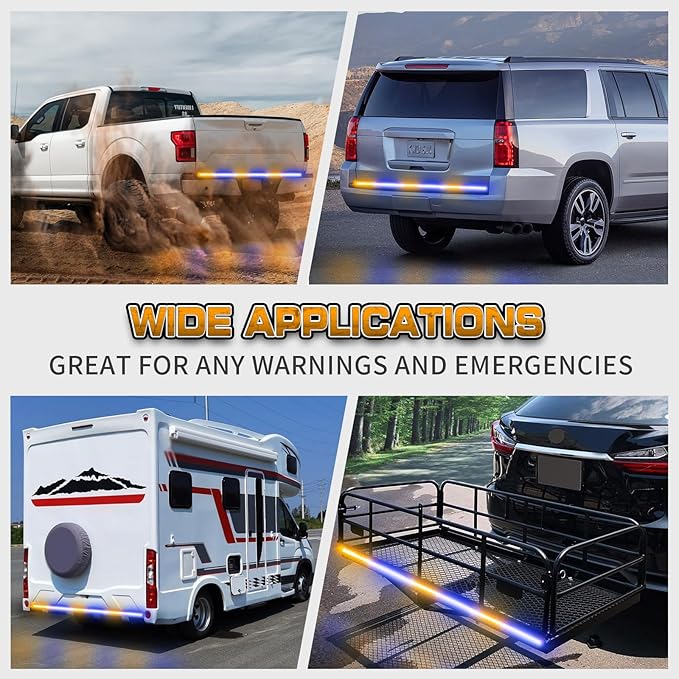 • 【WIDELY APPLICATION】The 48 inch amber and blue emergency lights widely used for Hazard Warning, First Responder, construction vehicles, Law Enforcement emergency vehicles and tow trucks, police, EMS, security, snowplow, postal workers, Off-Road,etc. ( If you need to hardwire the strip, please refer to the hardwired control box, ASIN:B0D1V79QNR)