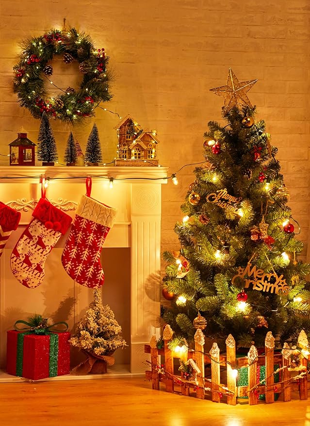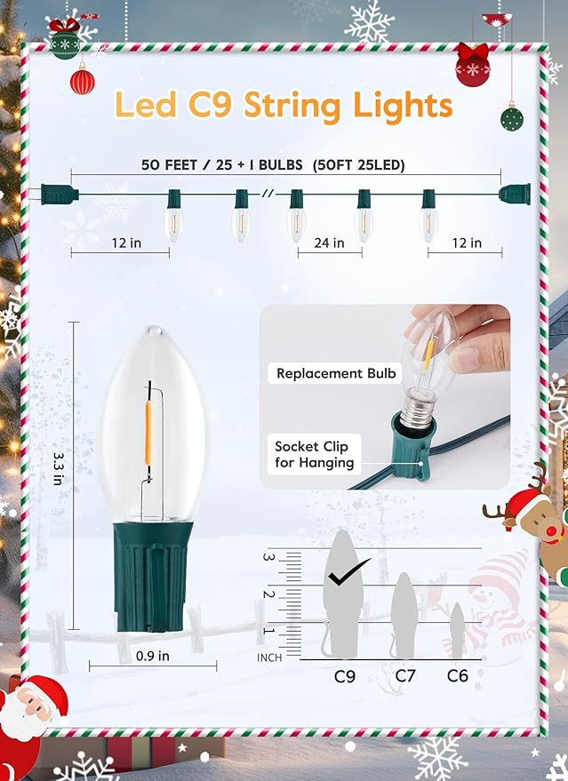 • Extra-Long 50Ft C9 Christmas Lights Outdoor: With a total length of 50 feet and 25 LED shatterproof clear warm white bulbs, these green wire outdoor C9 string lights illuminate larger spaces, creating a rich festive atmosphere