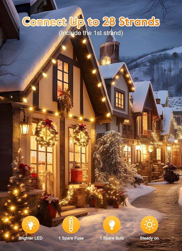 • Easy to Use and Connectable: Simple to install, with removable bulbs, these outdoor Christmas lights are plug-and-play. Each outdoor Christmas lights for house can be connected to up to 27 additional sets, making them perfect not only for Halloween, Thanksgiving, Xmas, and New Year’s decorations but also for weddings, parties, camping, family gatherings, living rooms, and café settings, effortlessly creating the desired ambiance