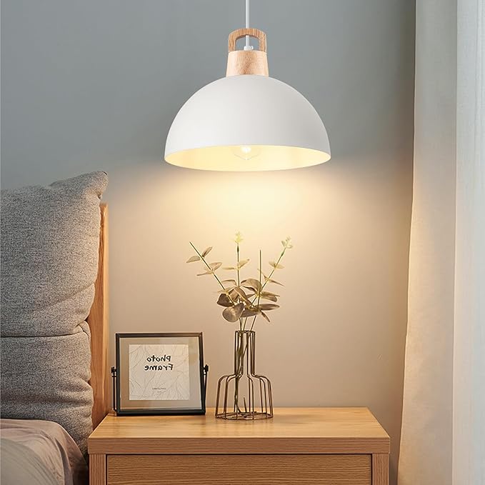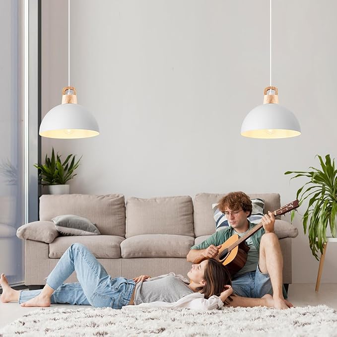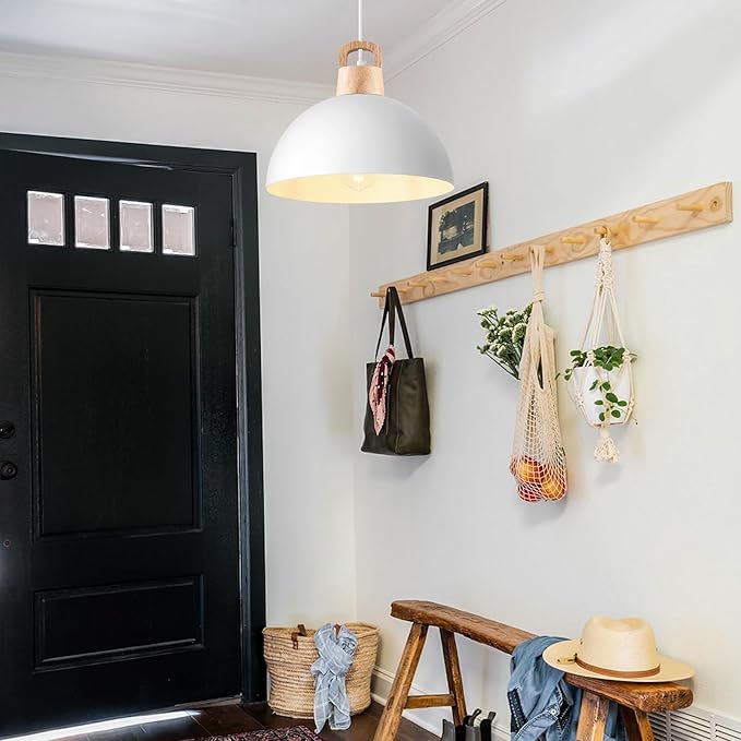 Perfect Design:This 3 packs white pendant lights kitchen island combines both farmhouse and industrial styles. The top of the industrial pendant light is wood, which enhances the design. This white pendant light are perfect for front warehouses, hallways, dining rooms, kitchen islands, worktops, stairwells, restaurants, etc.