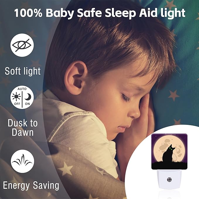 Halloween Spooky Black Cat Night Light Plug into Wall, Cat sit on Moon Dusk to Dawn Night Light,0.5w Energy Saving Sleep Friendly Nightlights for Kids Boys Girls Home Decor