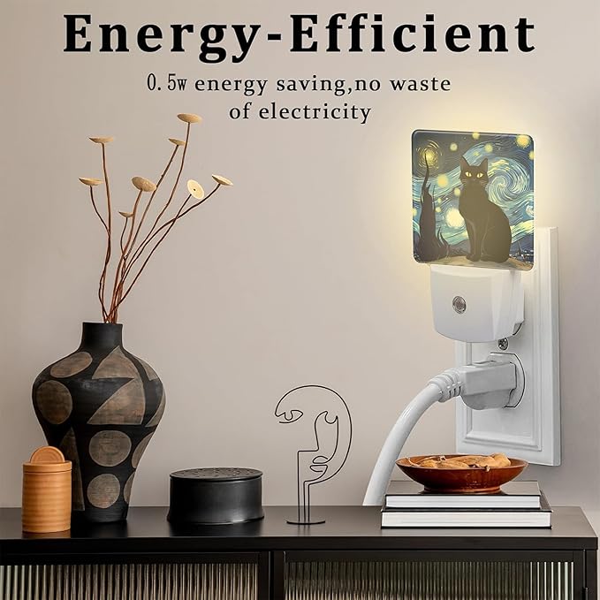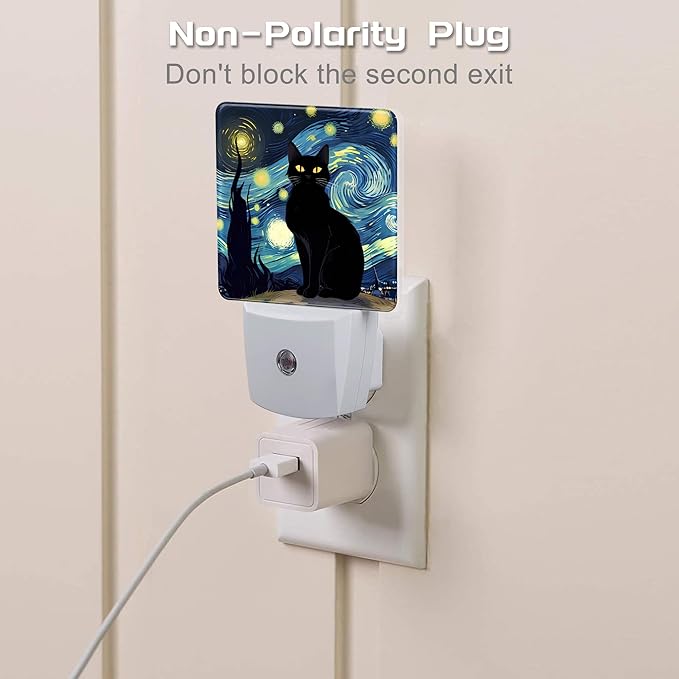Starry Night Black Cat Night Light Plug into Wall, Abstract Oil Painting Dusk to Dawn Night Light Plug in,0.5w Energy Saving Sleep Friendly NightLight for Kids Boys Girls Home Decor