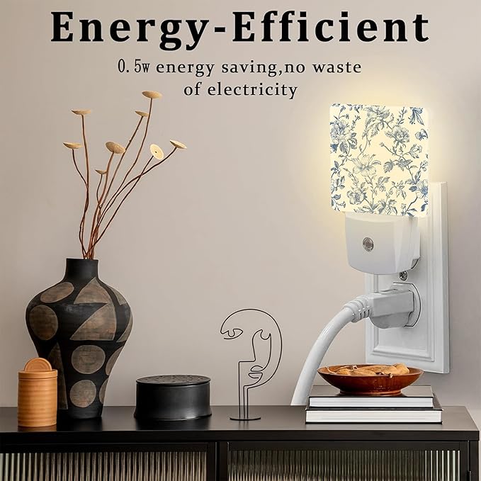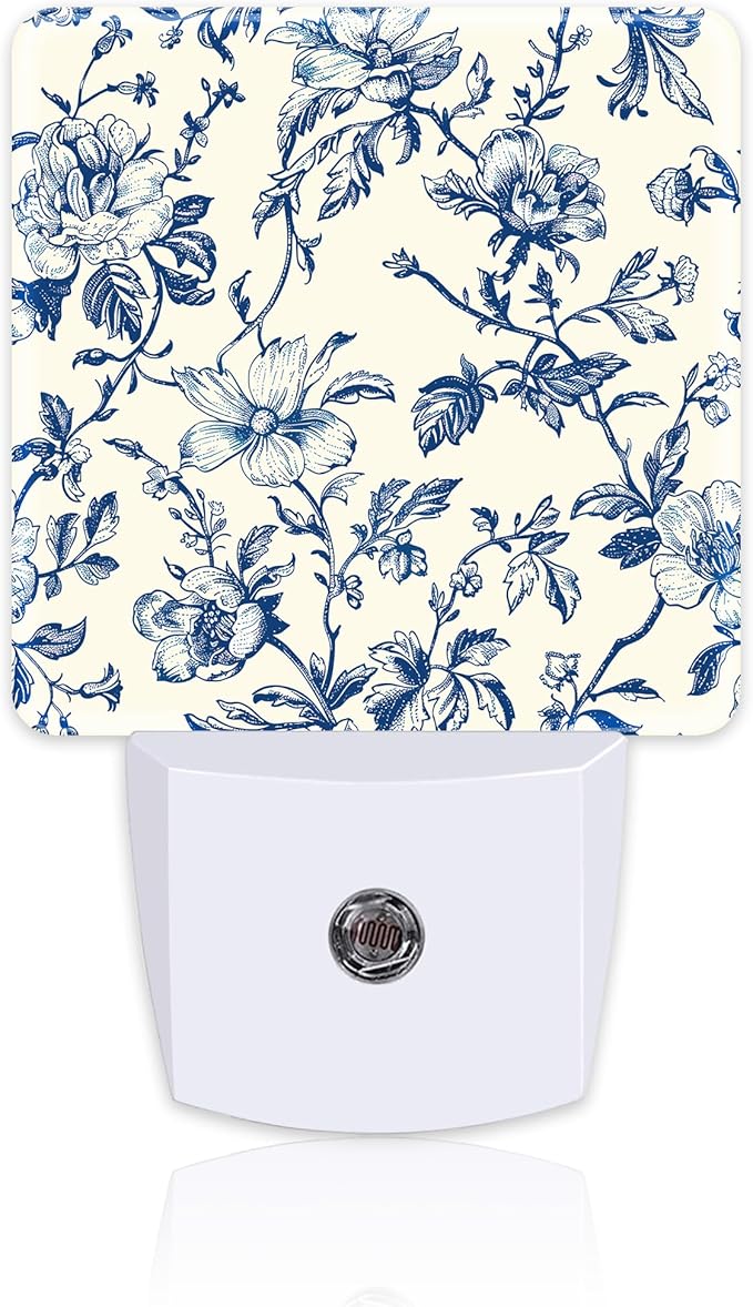 Vintage Blue Flowers Night Light, Abstract Botanical Floral Leaves Dusk to Dawn Night Light Plug in, 0.5w Energy Saving Sleep Friendly NightLight for Kids Boys Girls Home Decor
