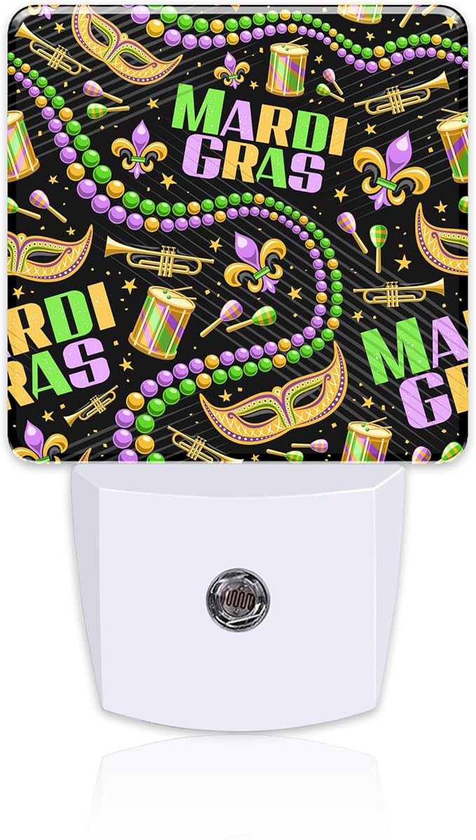 Happy Mardi Gras Night Light, Carnival Fleur De Lis Mask Beads Dusk to Dawn Night Light Plug in, 0.5w Energy Saving Sleep Friendly Nightlights for Kids Boys Girls Home Decor