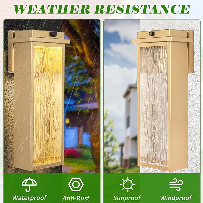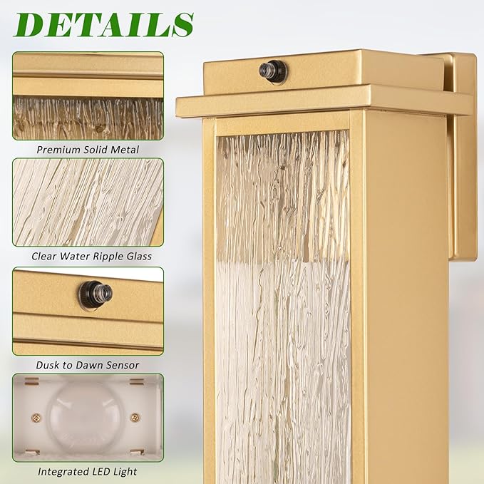 16" Dusk to Dawn LED Outdoor Light 2 Packs, Gold Outside Porch Lights Wall Mount, Large Exterior Lighting Fixtures with Rippled Glass, Waterproof Modern Wall Lantern for House, Patio