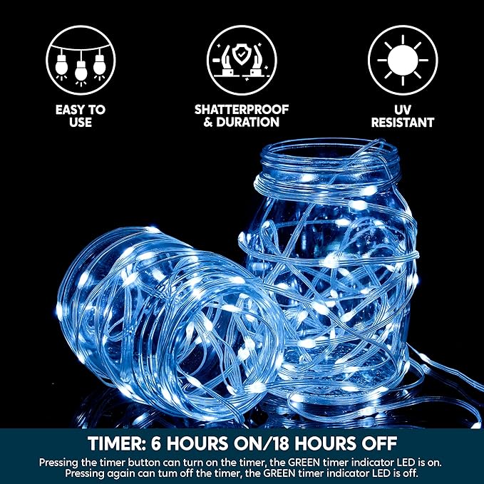 • Premium Quality. Our LED cool white Christmas string lights are designed with strong durability to accommodate harsh weather conditions. The high efficiency LED lights are environment-friendly and save power for you! If one bulb burns out, the others stay lit.