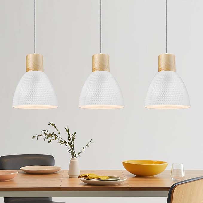 • 👍【 Modern Elegant Nordic Style 】With over 20 years of illumination production experience and a professional design team. ELYONA pendant light fixtures a classic Scandinavian style. Elegant white hammered metal shade with nature rubber wood, looks classic and contemporary, Ideal for Kitchen island, Dining Room, office, Living Room, Coffee Bar.