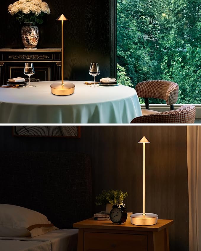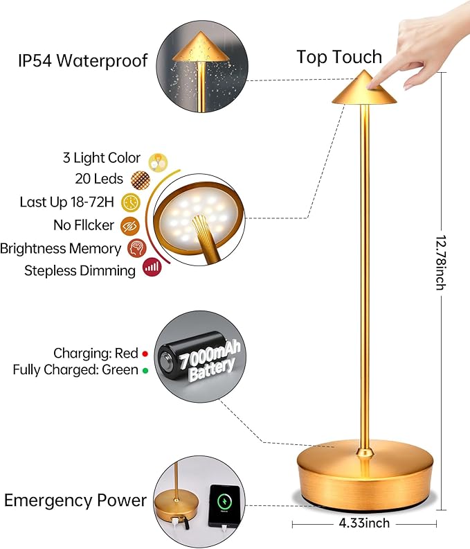• 【Dimming and Switching Color Temperature】Our cordless table light has 3 colors light: white light, warm white light and warm light. Click on the top of the lamp to switch light colors. Long press for the brightness (10%-100%). With upgraded 20 led memory light source, which remembers the brightness you adjusted so you don't have to adjust it the next time you turn on the light.
