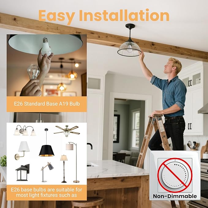 • E26 Base & Wide Application: These 3000K warm white bulbs feature a classic A19 shape with standard E26 screw base for tool-free installation in both indoor lamps and outdoor enclosed fixtures. Operating at 120V/60Hz, they emit natural-looking light ideal for residential, office, and commercial spaces