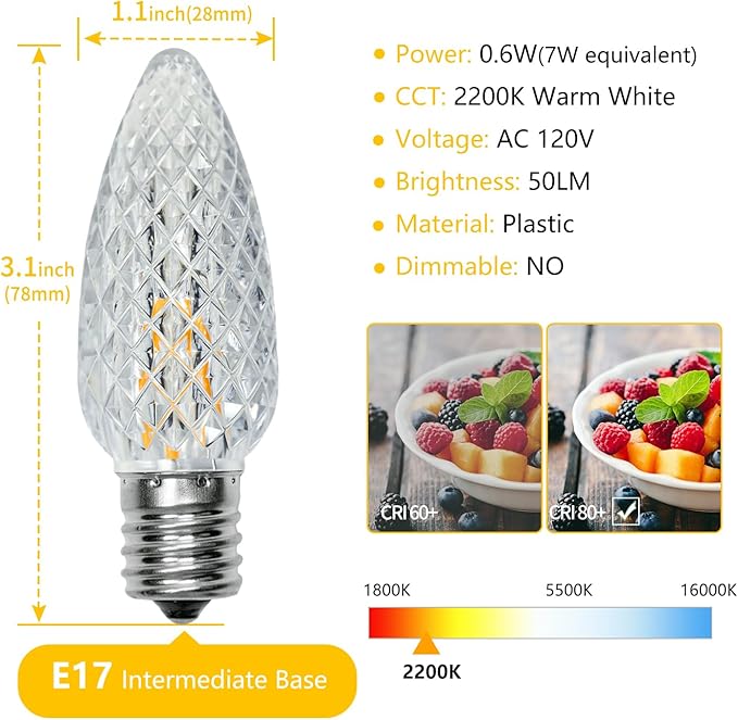 • C9 LED CHRISTMAS LIGHTS: Pack of 50 Plastic Strawberry shape LED C9 Christmas Replacement Bulbs, measure 1.1''(28mm) wide by 3.1''(78mm) tall (including the base). And the C9 Christmas lights have a candelabra screw base that fits E17 sockets.
