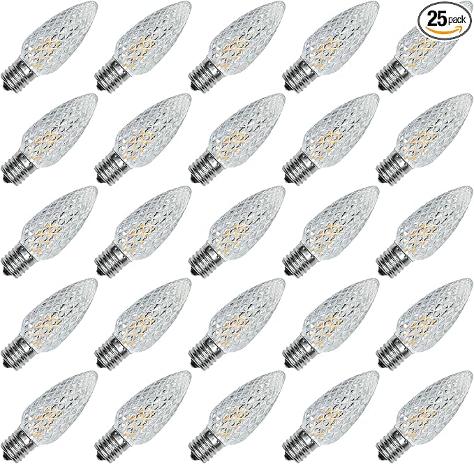 • WIDE APPLICATION: C9 led replacement bulbs are perfect for LED Chandelier bulbs, nightlights, decorative lighting, salt lamps, christmas string light, christmas villages, exterior patio light, dust electric candles, window electric lights and more. Bright LED C9 replacement bulbs create a festive atmosphere during the holidays.