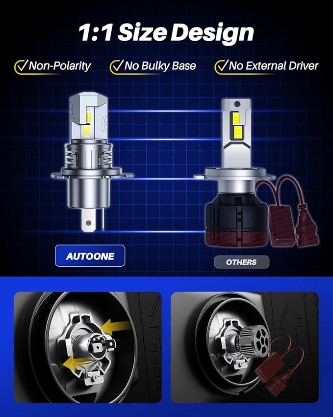 • Hassle-free Installation: AUTOONE hb2 H4 led fog bulbs feature a plug-and-play wireless and 1:1 size halogens’ design that allows people to get rid of bulky drivers and annoying wiring harnesses. No modifications on the enclosure or housing, 5 minutes easy installation
