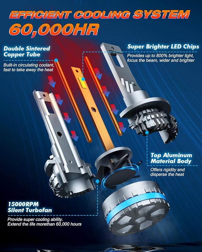 • Durable 70,000+ Hours Lifespan: Built with aerospace-grade aluminum and an advanced heat sink design, these h11 9005 fog light bulbs are equipped with a powerful 15,000 RPM turbo cooling fan. This ensures a lifespan of over 70,000 hours, reducing the need for frequent replacements and providing reliable long-term performance.