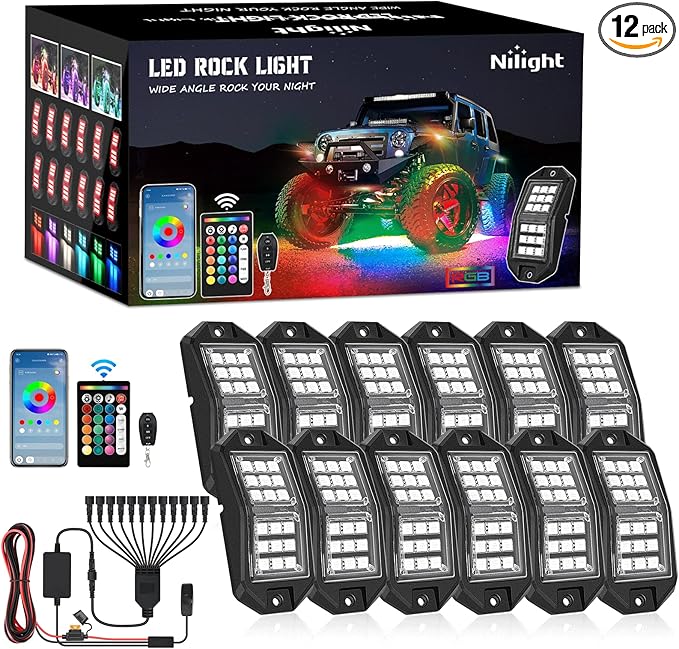 Nilight RGB LED Rock Lights Kit 12 PCS 18LED Wide Angle Wheel Well Light with Remote & Bluetooth App Dual Control Multi Modes Underglow Multicolor Neon Pod for ATV UTV SUV Offroad Truck RZR Boat