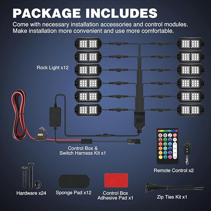 • Included Components : 12 x sets of rock lights with 117” wire, 12 x pcs sponge pad, 1 x 12 way splitter controller box with switch , 2 x remote, 1x zip ties kit and 1x user manual 12 x sets of rock lights with 117” wire, 12 x pcs sponge pad, 1 x 12 way splitter controller box with switch , 2 x remote, 1x zip ties kit and 1x user manual