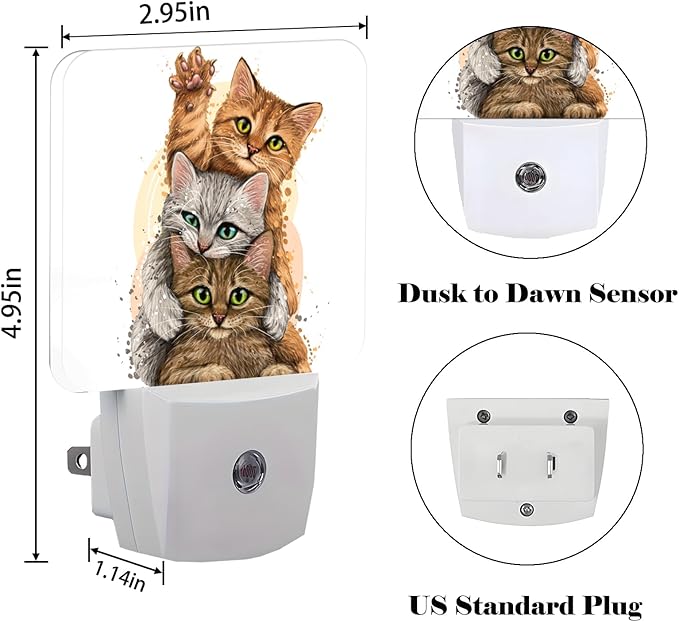Three Cute Kittens Night Light,Plug Into Wall for Boys Girls Bedroom Decorative Square Night Light Lamp 0.5w Sleep Friendly