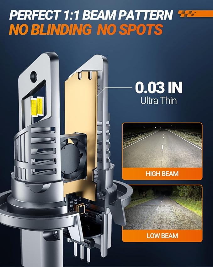 • 【Pefect 1:1 Lighting】The 0.03-inch ultra-thin copper substrate addresses issues like flickering and dimming. The focused lighting minimizes disturbance to oncoming traffic, enhancing safety on the roa