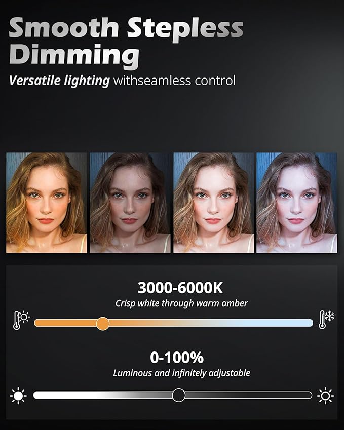 • 【Professional Lighting Effects】The ring light uses high-quality lens beads to diffuse light evenly, minimizing shadows and hotspots. With a color temperature range of 3000-6000K and smooth dimming, users can easily switch from cool blue to warm amber for the ideal atmosphere and realistic skin tones. It also provides ample lighting in any environment, greatly improving shooting quality.
