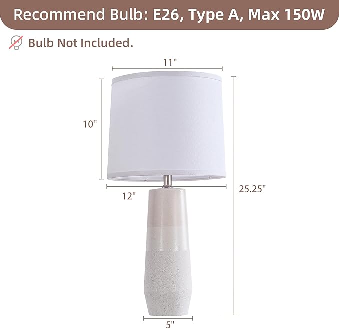 • Safety & Warranty: EUO 25.25" White Ceramic Table Lamps Set of 2 is suggested to use one 150W maximum type A bulb with an E26 base socket (bulb not included). We provide a 12-month warranty for the white lamps set of 2. EUO is willing to provide support to you at any time if needed.