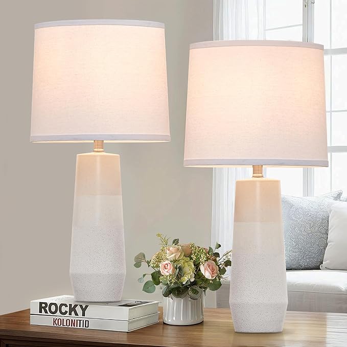 • Ceramic White Lamps Set of 2 for Bedroom: The white table lamps set of 2 is easy to turn on/off through a rotary switch, which is convenient to use in a dark environment, creating a cozy and comfortable atmosphere. The barrel lampshade ensures a wide and effective illumination range, so the ceramic table lamp is also recommended to use as a bedtime reading lamp on nightstand.