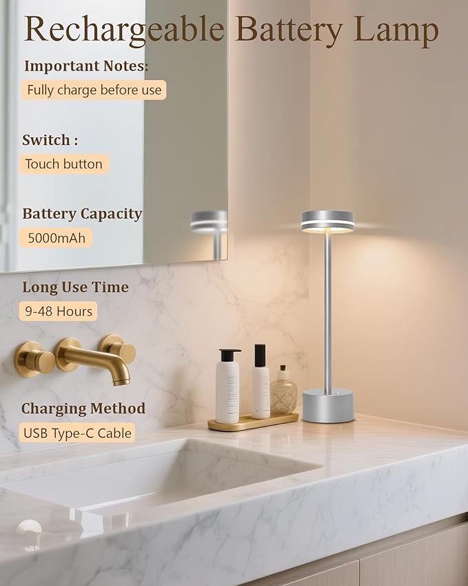 • 【Rechargeable & Long Battery Life (5000mAh)】With a built-in 5000mAh battery, this USB-C rechargeable table lamp provides 9-48 hours of cordless lighting. No need for constant charging—great for bedside tables, desks, dining rooms, and even outdoor spaces. Whether used as a wireless nightstand lamp, power outage backup light, or portable study lamp, it offers convenience anywhere