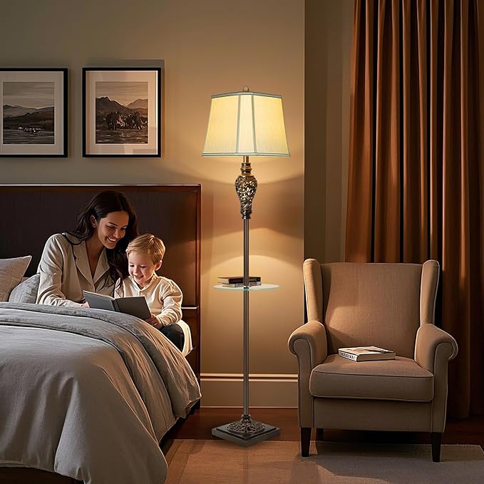 Rustic Floor Lamp for Living Room with Nightlight and Glass Tray, Vintage Standing Lamp with Beige Faux Silk Shade, Farmhouse Tall Lamp for Bedroom Study Home Office Hotel Bar - Brown (Bulb Included)