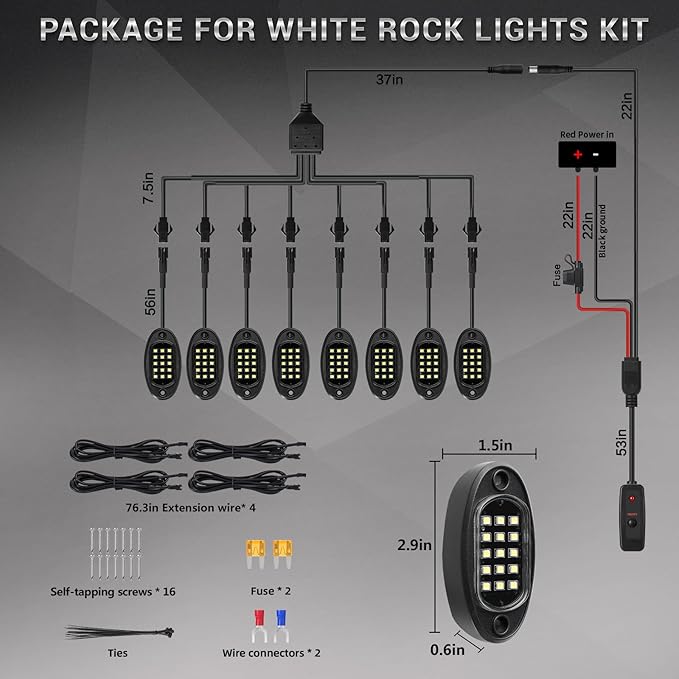 • EASY TO INSTALL DESIGN: Pure white rock light with convenient wiring connector (splitter), eliminates complex wiring to mak installation process easier. Equipped with a power switch to turn on or off light at any time, to prevent unnecessary battery drain (built-in 5A fuse). Additionally, 4pcs 78.74 IN extension cords are provided for longer distance installation in truck. With self-tapping screws, tie wraps, heat shrink wire connectors, fuses, ect tools to make your installation even easier.