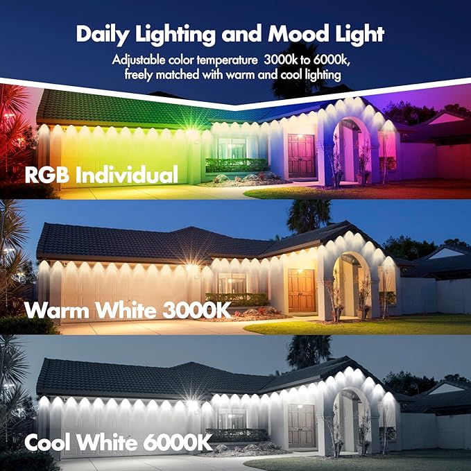 • 【Simple Installation and Enhanced RGB Lighting】:Our permanent outdoor lights comes with an installation manual, which can be quickly installed by following the steps. Our multifunctional lights not only meet holiday decorations, but also meet daily lighting requirements. Soft RGB light quickly illuminates your outdoor area, creating a comfortable and warm atmosphere for any occasion. Whether you are hosting a family gathering, spending quality time with friends, or seeking peaceful moments alone, it can easily fulfill your requirements.