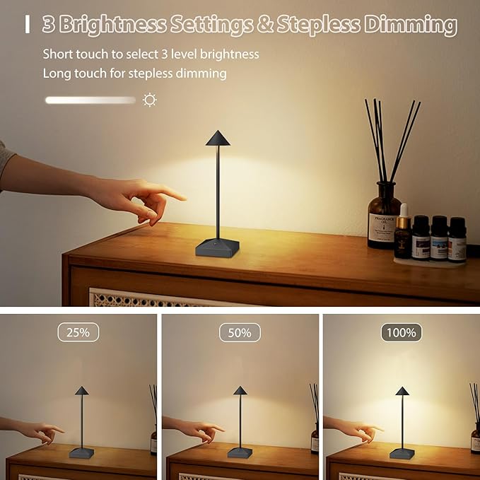 • 【Touch dimming & Easy operation】We have built a rechargeable battery in the cordless lamp, which can help you save the cost of purchasing AA batteries. You can easily control the light ON/OFF or brightness adjustment for your needs. With the very dim set, it's good to be an night light for bedside, while with bright set, it's also a nice decor for living room windowsill, hallway and balcony, or as a daily light supplement for work.