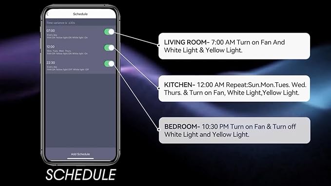 • 【Timers Function & Schedule Function】: With the schedule function, you can create a schedule for fans in different rooms. For example, “Smart ceiling fan with light in living room: Fan: on. Yellow light: on. White light: on. Time: 18:00. Repeat: Everyday. Notification: off.” ”Black ceiling fan in study room: Fan: on. Yellow light: on. White light: off. Time: 21:00. Repeat: Mon-Fri. Note: Read Book. Notification: on.” You can automatically turn off after hours by the timer function.