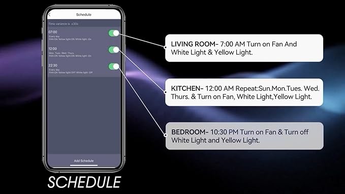 • 【Timers Function & Schedule Function】: With the schedule function, you can create a schedule for fans in different rooms. For example, “Smart ceiling fan with light in living room: Fan: on. Yellow light: on. White light: on. Time: 18:00. Repeat: Everyday. Notification: off.” ”Black ceiling fan in study room: Fan: on. Yellow light: on. White light: off. Time: 21:00. Repeat: Mon-Fri. Note: Read Book. Notification: on.” You can automatically turn off after hours by the timer function.