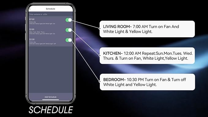 • 【Timers Function & Schedule Function】: With the schedule function, you can create a schedule for fans in different rooms. For example, “Smart ceiling fan with light in living room: Fan: on. Yellow light: on. White light: on. Time: 18:00. Repeat: Everyday. Notification: off.” ”Black ceiling fan in study room: Fan: on. Yellow light: on. White light: off. Time: 21:00. Repeat: Mon-Fri. Note: Read Book. Notification: on.” You can automatically turn off after hours by the timer function.