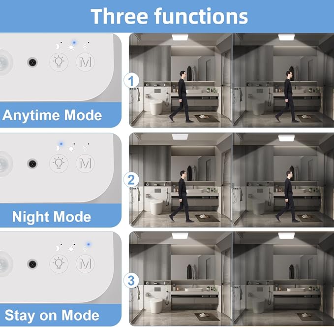 • 【3 Motion Sensor Modes】Our closet lights battery operated for home offer three modes (anytime, night, and always-on modes). They represent: ①No matter it is in the daytime or at night, the indoor motion sensor light will be on once motion is sensed. ② It works only at night and when ambient light is lower than 15LUX. ③Like ordinary bathroom lights without motion sensing function, it is turned off by using the remote controller.