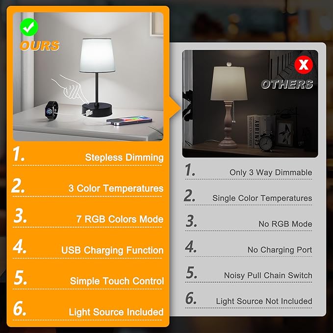 • ๐—จ๐—ฆ๐—•-๐—” ๐—ฎ๐—ป๐—ฑ ๐—จ๐—ฆ๐—•-๐—– ๐—–๐—ต๐—ฎ๐—ฟ๐—ด๐—ถ๐—ป๐—ด ๐—ฃ๐—ผ๐—ฟ๐˜๐˜€: Not just a source of light but also a convenient charging station. Our bedside Lamp is equipped with 2 usb ports (5V/2A) . This modern addition caters to your charging needs, keeping your devices powered and within reach. Please note: The USB ports does not support fast charging. When two USB ports are used at the same time, the output current is 1A per USB port, and when one is used alone, the output current is 2A.