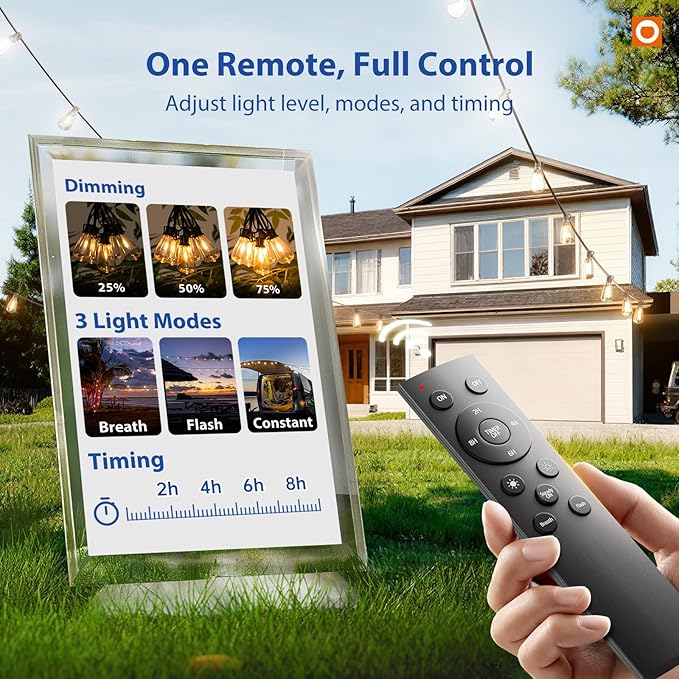 • 【 Illuminate Your Paradise 】200FT outdoor lights with 60 sockets and 64 shatterproof LED bulbs(4 spare bulbs), 3FT apart. Dimmer-ready for versatile lighting, 5%-100% adjustable. Set the mood effortlessly