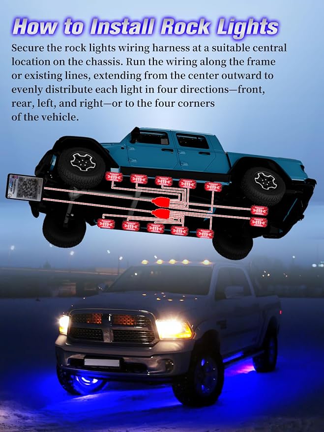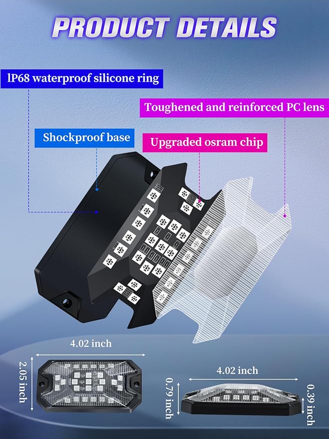 • 3 Control Methods: Underglow LED rock light kit is equipped with APP control/ 24 key RF remote/ 4 key RF remote. You can through the APP change the rock lights' 16 million RGB static colors, 29 dynamic modes, brightness, speed, music mode, sound control mode, and timing function. Meet the different personalized needs of users and create a unique appearance atmosphere for the vehicle
