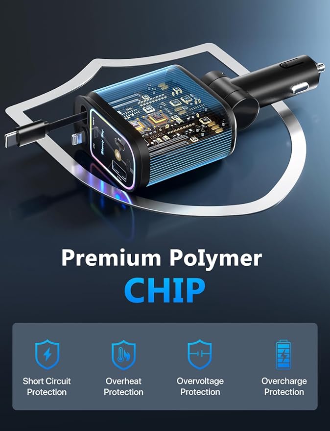 • 【4 in 1 Retractable Car Charger】: The 4-in-1 Fast Car Charger with two retractable cables (Type-C and IOS) and two additional ports (USB-C and USB-A), eliminating the hassle of carrying multiple cables and chargers. This car charger adapter allows for fast charging of up to four devices simultaneously, eliminating the need for multiple chargers and keeping your car clutter-free.