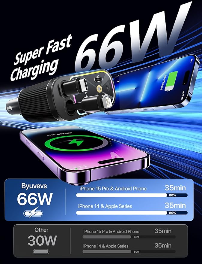 • 【Fast Charging】: Equipped with the latest fast charging technology, this fast car charger adapter provides up to 66W of power through its multiple ports. The Type-C port offers up to 66W, and the USB-A port up to 20W.