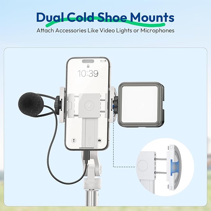 • 【Dual Cold Shoe Mounts for Accessories】 Two cold shoe mounts of selfie stick for iphone on the top sides of the clip provide expansion options for microphones, LED lights, and other photography gear—perfect for vlogging, selfies, and professional content creation.