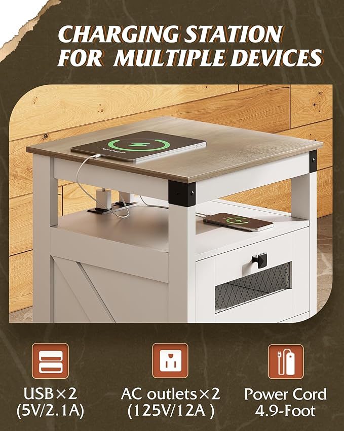 • [Durable&Stable]: This wooden 2-drawer end table with charging station with smooth metal glides is made of a mixture of particleboard and frame, which has excellent durability and stability. This farmhouse bedside table can be used for a long time, unnecessary for replacement. The capacity can reach up to 22 lbs, meeting your daily basic needs.